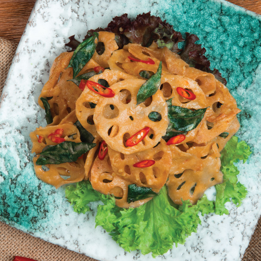 Must try Crispy lotus thin piece coated with salted egg sauce, chili padi and curry leaf.
